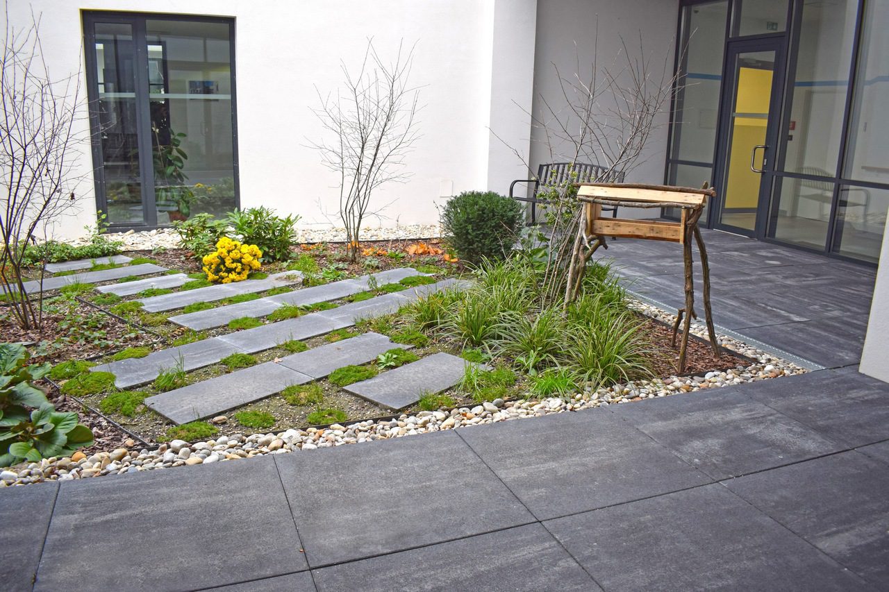 V tomto ekologicky orientovanom koncepte majú svoje nezastupiteľné a pevné miesto udržateľné riešenia. Zatrávňovacia dlažba je pre prírodnú záhradu dokonalou voľbou. Spoľahlivo prepúšťa zrážkovú vodu priamo do podložia a jej veľké drenážne otvory s priemerom až deväť centimetrov možno vyplniť kvalitnou zeminou a osiať trávou. Získate tak spevnenú plochu, ktorá nepôsobí zastavane.