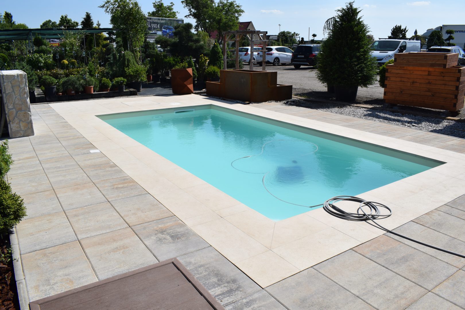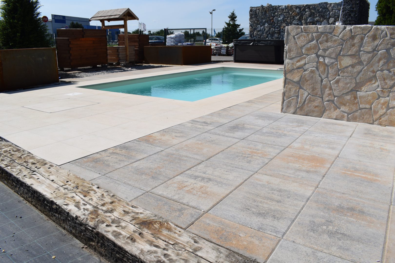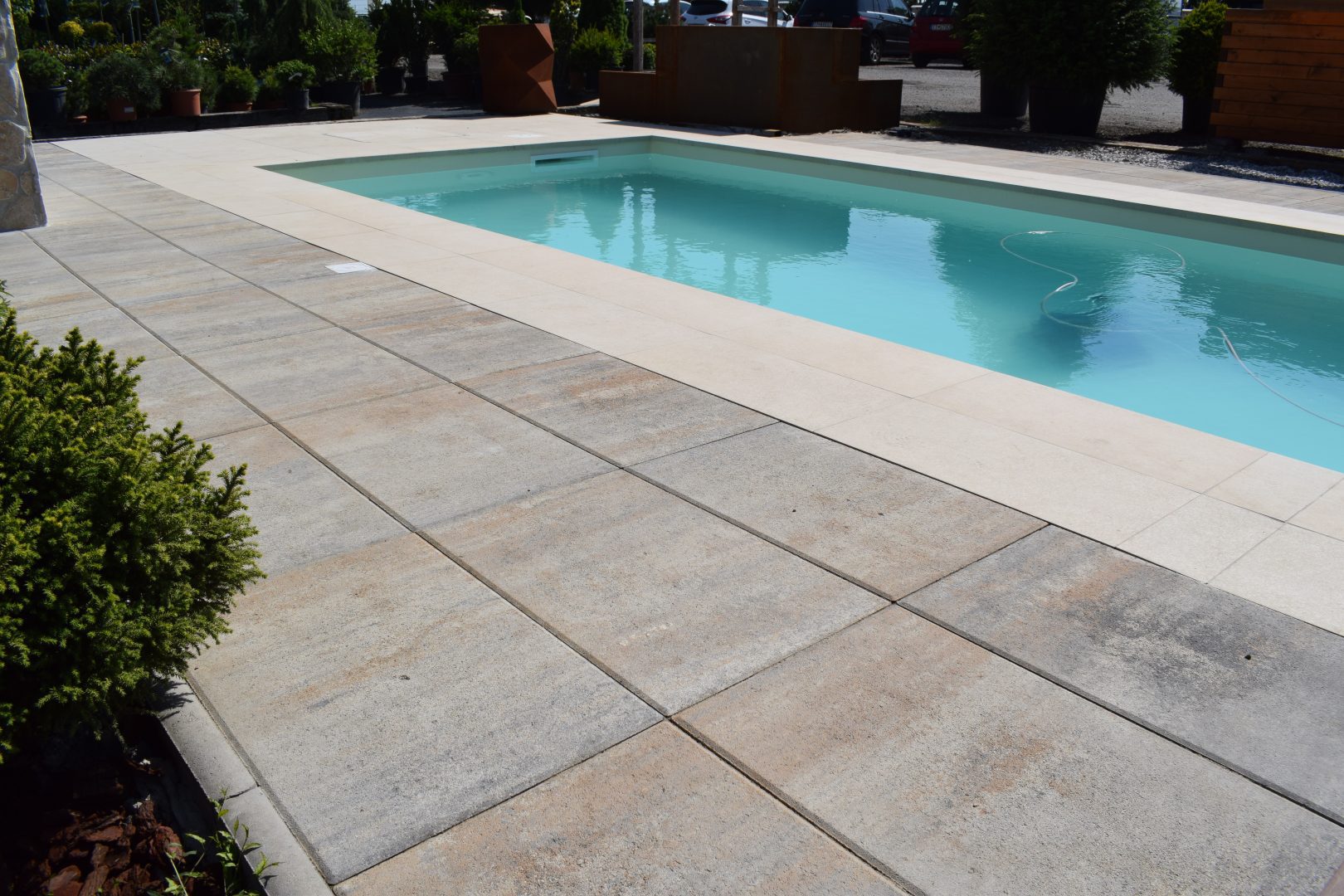 S vodnou plochou bazéna vám vytvorí krásny kontrast teplý odtieň dolomite, nič nepokazíte ale ani s odtieňom granito, ktorý je ladený do šedých farebných tónov.